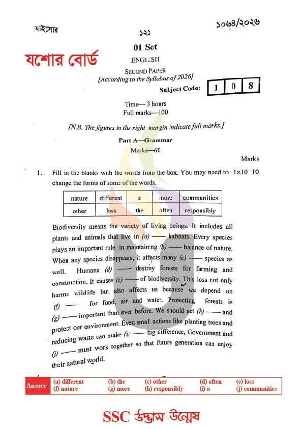 SSC ২০২৬ যশোর বোর্ডের ইংরেজি ২য় পত্রের সম্পূর্ণ solution এই পোস্টে পাওয়া যাবে।