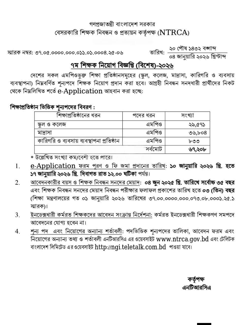 গণপ্রজাতন্ত্রী বাংলাদেশ সরকারের বেসরকারি শিক্ষক নিবন্ধন ও প্রত্যয়ন কর্তৃপক্ষ (NTRCA) দেশের এমপিওভুক্ত শিক্ষা প্রতিষ্ঠানসমূহে শিক্ষক নিয়োগের লক্ষ্যে ১৮তম শিক্ষক নিয়োগ বিজ্ঞপ্তি (বিশেষ)–২০২৬ প্রকাশ করেছে।
